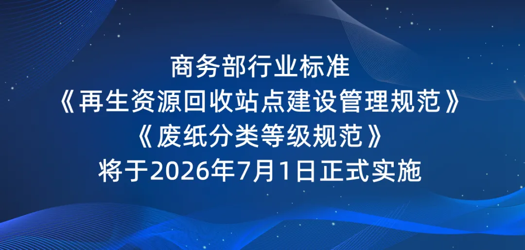 商務(wù)部行業(yè)標(biāo)準(zhǔn)《再生資源回收站點建設(shè)管理規(guī)范》《廢紙分類等級規(guī)范》將于2026年7月1日正式實施