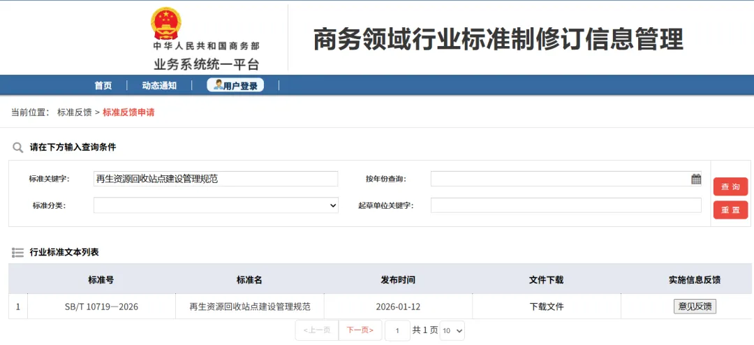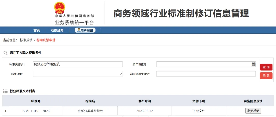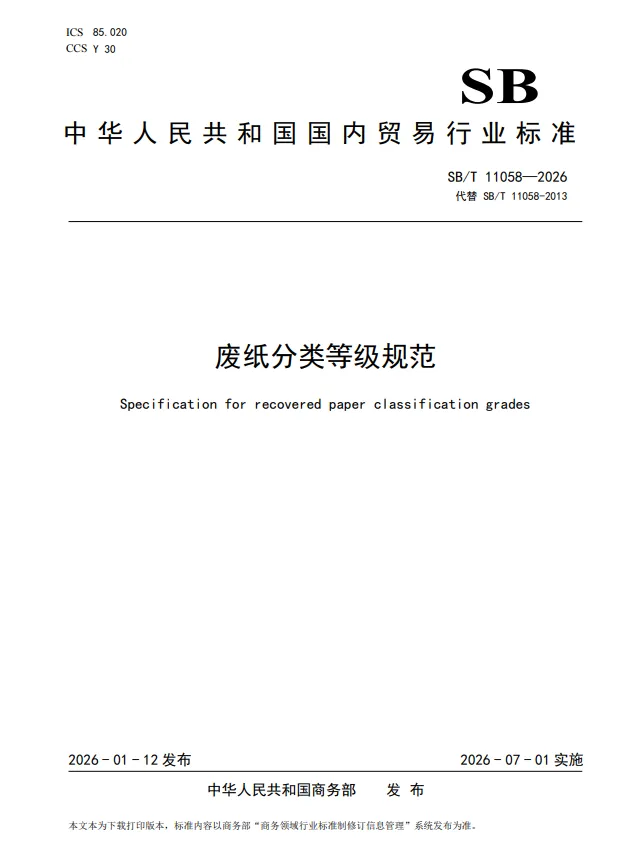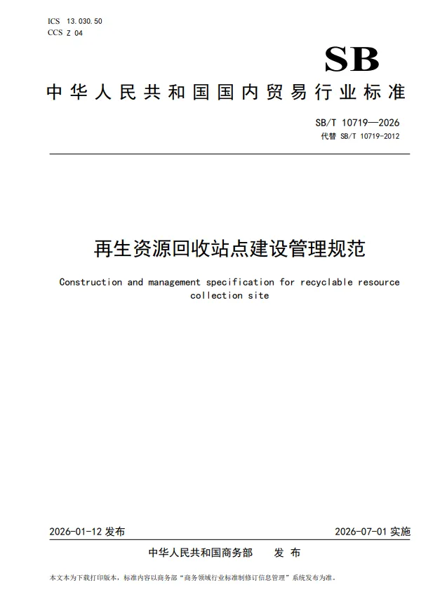 【編者按】為破解行業(yè)發(fā)展瓶頸,落實國家資源循環(huán)利用體系建設(shè)要求,商務(wù)部辦公廳于2024418日下達(dá)《關(guān)于調(diào)整商務(wù)領(lǐng)域行業(yè)標(biāo)準(zhǔn)計劃項目的通知》(商辦建函〔2024302號),并委托中國再生資源回收利用協(xié)會對《再生資源回收站點建設(shè)管理規(guī)范》(SB/T 10719-2012)和《廢紙分類等級規(guī)范》(SB/T 11058-2013)進行修訂。商務(wù)部于2026 年 1 月 12 日發(fā)布 2026 年第 5 號公告,正式公布新修訂的兩項行業(yè)標(biāo)準(zhǔn),并將于 2026 年 7 月 1 日起全面實施。本次兩項標(biāo)準(zhǔn)修訂分別歷時5年和9年,先后調(diào)研走訪了國內(nèi)40余個城市百余家企業(yè),聽取了業(yè)內(nèi)百余位專家企業(yè)意見修訂而成,旨在健全再生資源回收環(huán)節(jié)標(biāo)準(zhǔn)體系,強化回收站點的綠色化、規(guī)范化運營能力,提升廢紙等重點品類的分類精度和利用價值,推動再生資源行業(yè)高質(zhì)量發(fā)展。